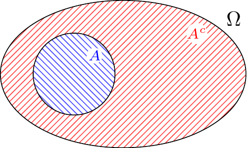 In Figure 4.1, the area of the event \(A\), shaded in blue, represents the probability \(P(A)\). Since Kolmogorov’s second axiom (see Definition 3.1) requires \(P(\Omega) = 1\), we imagine that the area of the entire sample space is one. Therefore, \(P(A)\) can be thought of as the proportion of the sample space that \(A\) occupies.