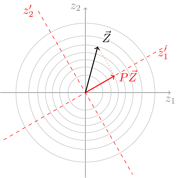 We make this argument precise in Theorem 46.2. However, the essential idea is illustrated in Figure 46.1, which shows the contour lines of the multivariate normal PDF for \(n=2\). (Each line represents a constant value of the PDF.) Because the contour lines are circular, the PDF of \(\vec Z\) does not change if we rotate the axes, so we can choose any axes that are convenient—in particular, we can choose the axes so that the first \(k\) line up with the subspace onto which \(P\) projects. In Figure 46.1, \(P\) projects onto a \(k=1\)-dimensional subspace, and we have chosen \(z'_1\) to line up with this subspace.