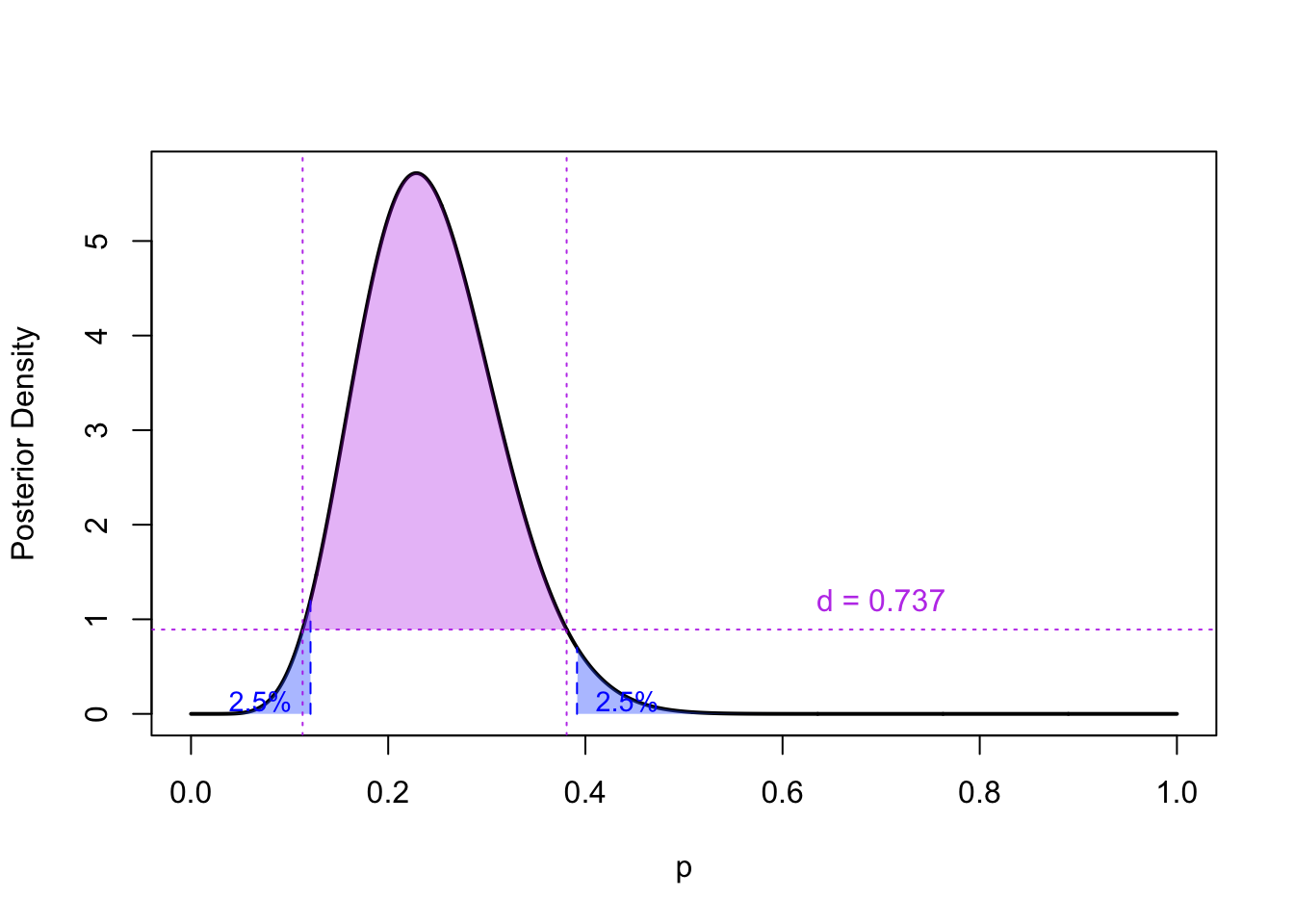 Exercise 48.1 (Comparing credible and confidence intervals) Calculate the 95% credible intervals (using the two approaches) for Agnes. Compare these intervals with the confidence interval for \(p\) in Example 47.4, which was \([0.143, 0.476]\).