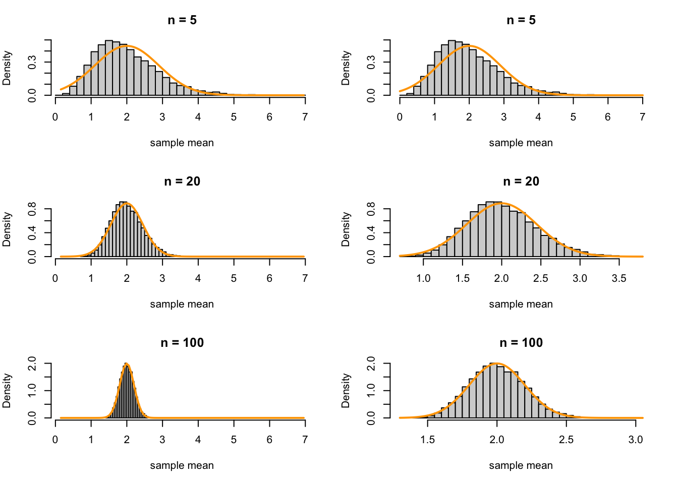 Figure 36.1: Simulated values of \(\bar X_n\) for \(n=5, 20, 100\), where \(X_1, X_2, \dots\) are i.i.d. \(\textrm{Exponential}(\lambda=0.5)\). In the left column, the \(x\)-axis is held fixed, while in the right column, we zoom in on the \(x\)-axis as \(n\) increases.