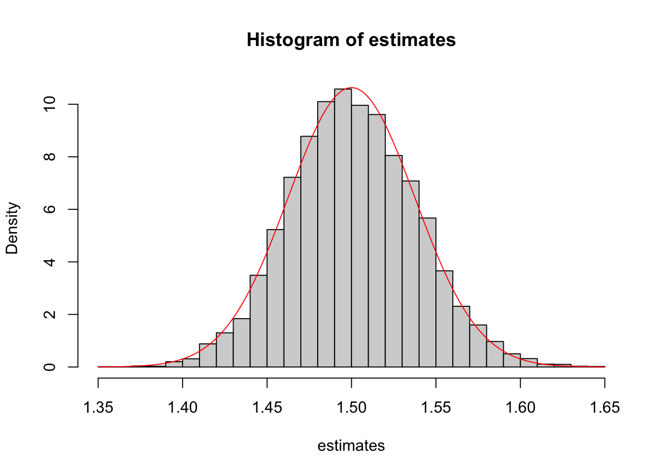 The estimates nearly always come out to within \(0.10\) of the true value, \(\lambda = 1.5\), as predicted by consistency. Perhaps surprisingly, the sampling distribution also appears to be approximately normal. We explore this phenomenon in the next section.